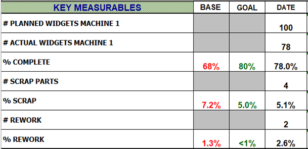 The chart above shows both base and goal numbers in their own columns, along with the date’s performance. Notice that some numbers are grayed out. This is because an individual area of planned-to-actual may be consistent enough on a daily basis to have a hard base number. If there are variables in the quantity of widgets run or the quantity of scrap and rework, however, the recorded percentages provide an accurate comparison of performance. With this information your organization can see trends and make decisions based on actual data.
